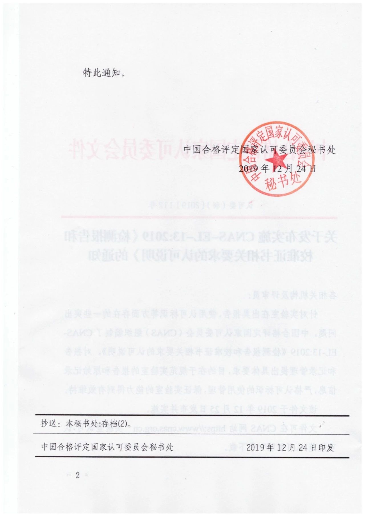 關(guān)于發(fā)布實(shí)施CNAS-EL-13:2019《檢測報(bào)告和校準(zhǔn)證書相關(guān)要求的認(rèn)可說明》的通知
