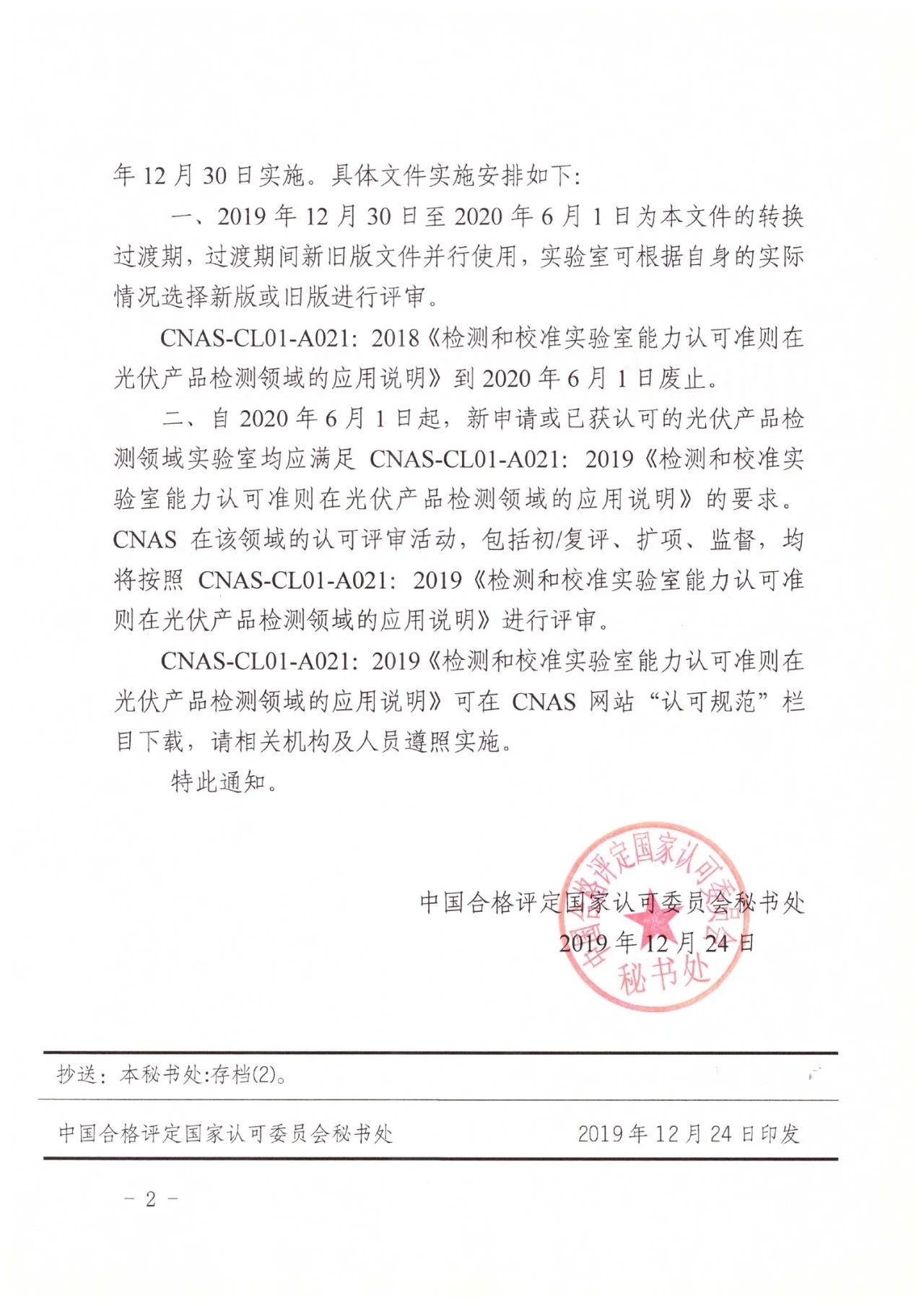 關(guān)于發(fā)布CNAS-CL01-A021:2019《檢測和校準(zhǔn)實(shí)驗(yàn)室能力認(rèn)可準(zhǔn)則在光伏產(chǎn)品檢測領(lǐng)域的應(yīng)用說明》及其實(shí)施安排的通知