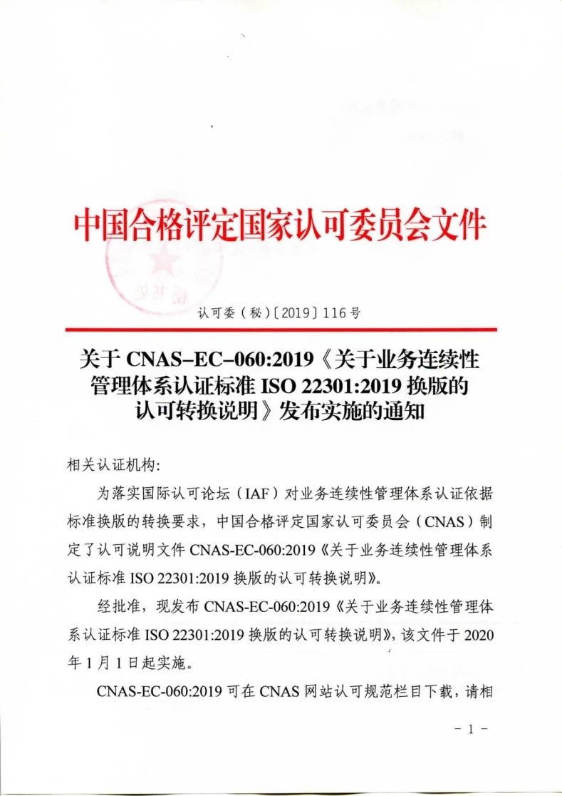 關(guān)于CNAS-EC-060:2019《關(guān)于業(yè)務(wù)連續(xù)性管理體系認(rèn)證標(biāo)準(zhǔn)ISO22301:2019換版的認(rèn)可轉(zhuǎn)換說明》發(fā)布實(shí)施的通知